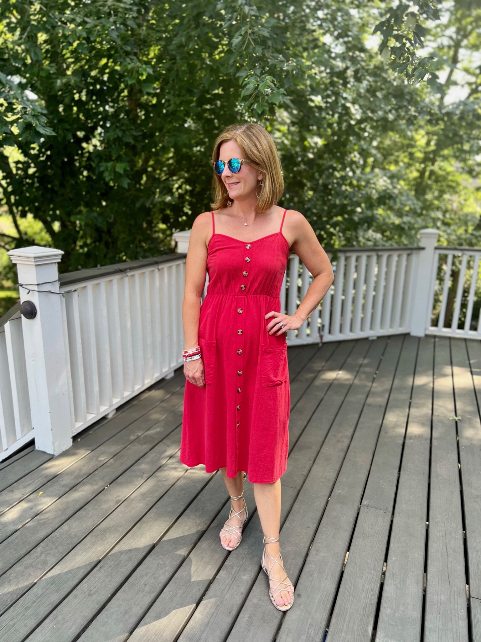 Spaghetti Strap Midi Dress & Metallic Sandals Look | Ruffle Neck Tank & Distressed Cutoffs Look
