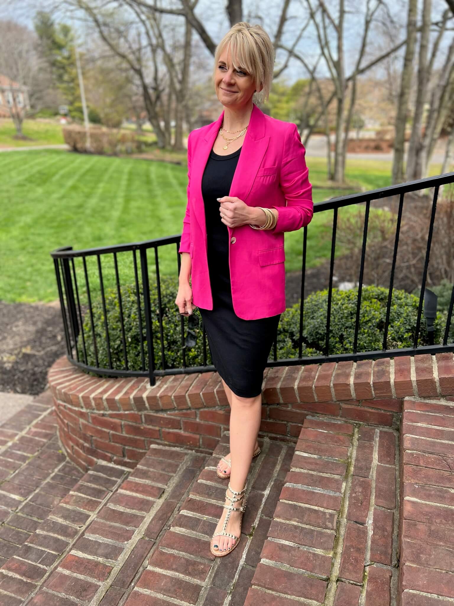 Hot Pink Blazer & White Jeans | Hot Pink Blazer & Midi Dress | Hot Pink Blazer & Blue Wide Leg Pants