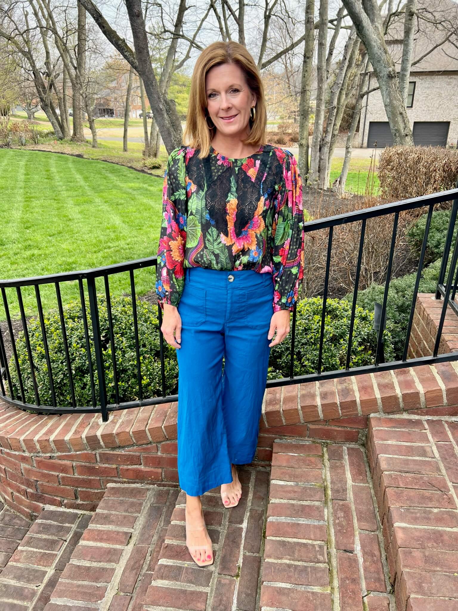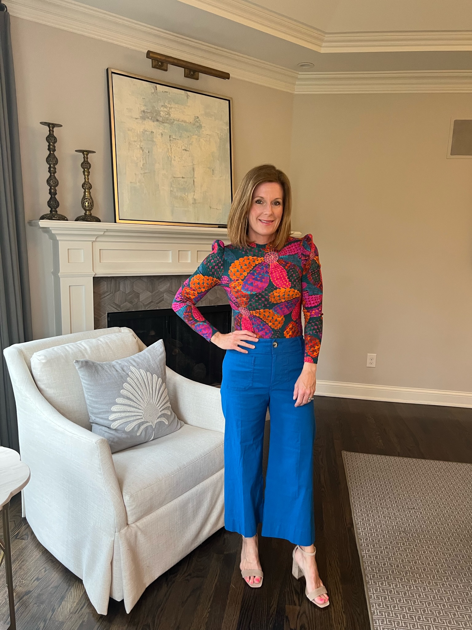 And yet another pair of brightly colored pants in a more streamlined silhouette in bright blue!  Love how SEB has continued on with the bold color with patterned tops in bright colors in both of these looks!  When going this route, keep your jewelry, shoes, and bag simple and neutral.