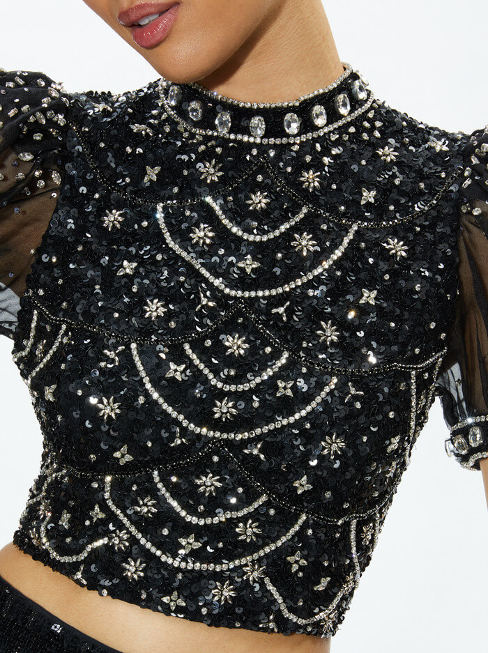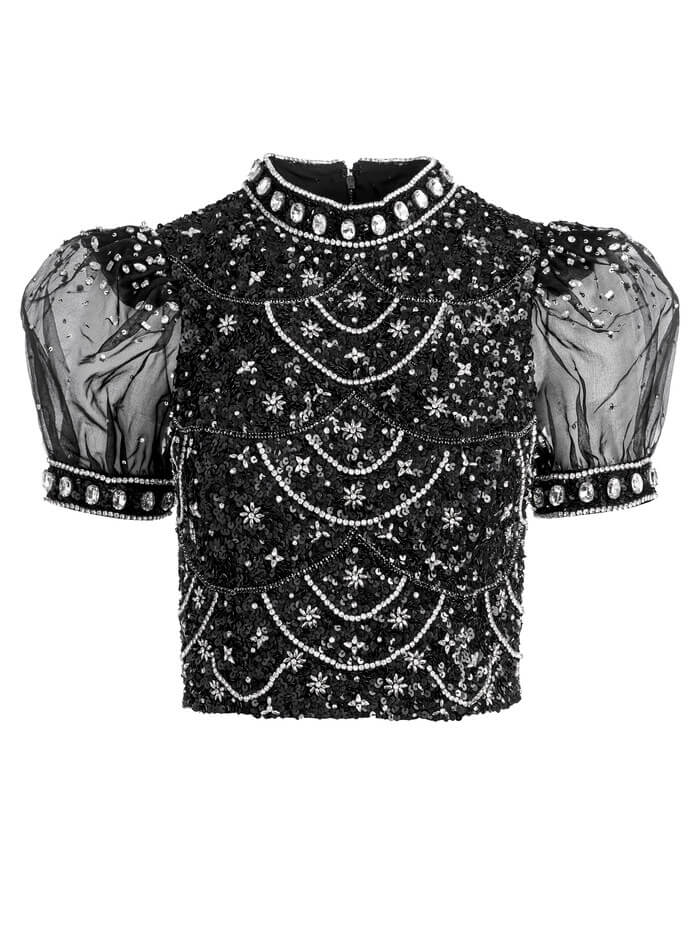 This embellished top would look great with a loose black trouser or straight leg leather pant. Add some simple silver jewelry to finish off your look.