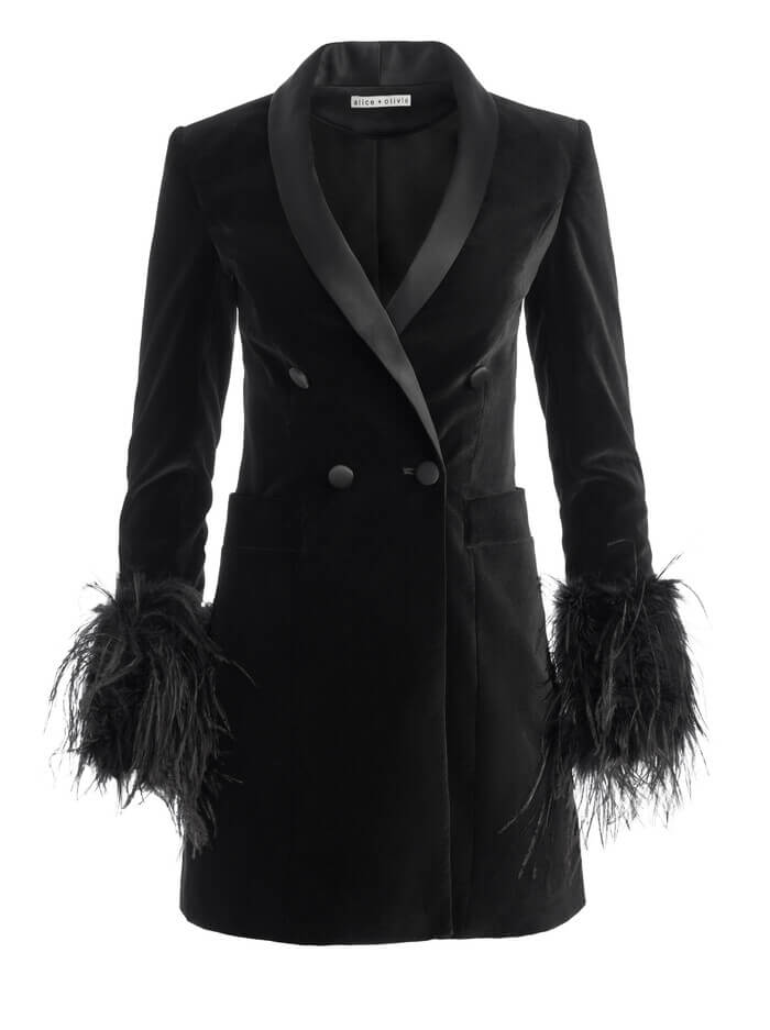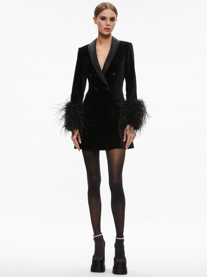 The feather cuffs add a fun detail to this classic blazer dress. This dress is perfect for a holiday party that requires cocktail attire.