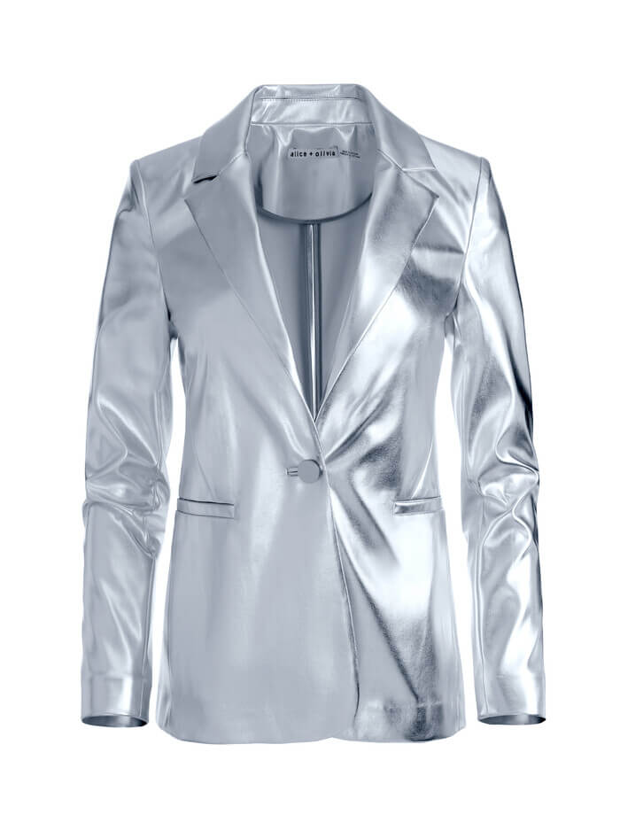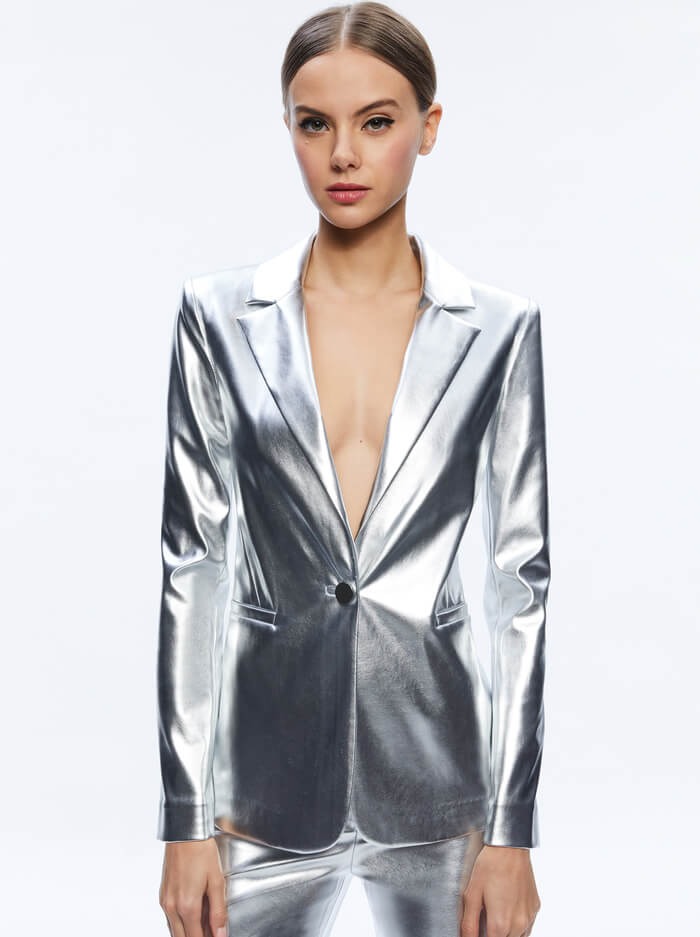 This metallic blazer is a fun way to incorporate the silver trend. Style this blazer with a pencil skirt or cigarette leg black pant.