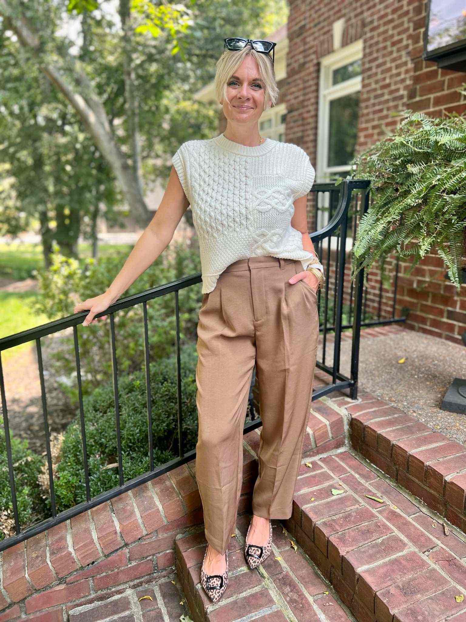 A sweater vest is the perfect layering piece for fall. Wear a slimmer cut vest under a blazer for a fun workwear look. Take the blazer off for a fun after work drinks and dinner look!