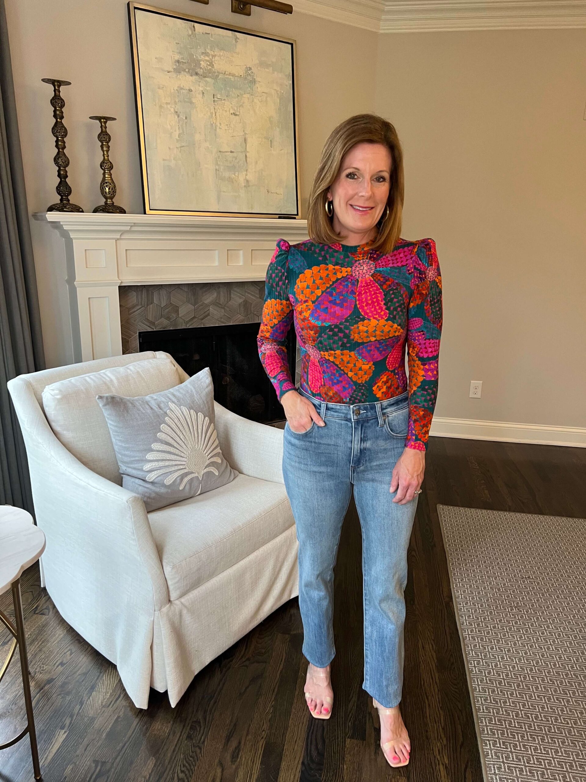This printed bodysuit is absolute perfection. Wear it alone as a statement piece or layered under jackets and blazers. The colors are gorgeous. The ribbed detailing and slight puff sleeves adds a touch of texture and femininity to the capsule.