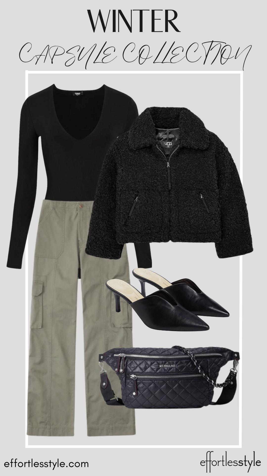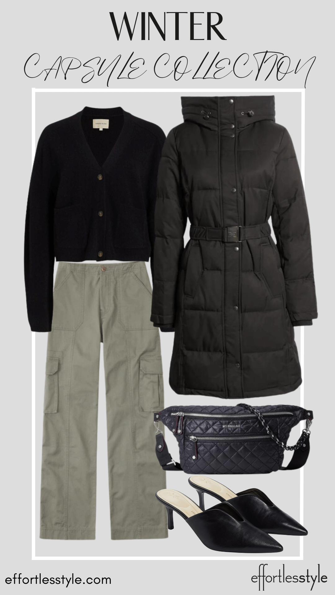 Puffer Coat & Cropped Cardigan & Cargo Pants | Puffer Coat & Black Bodysuit & Dark Wash Jeans