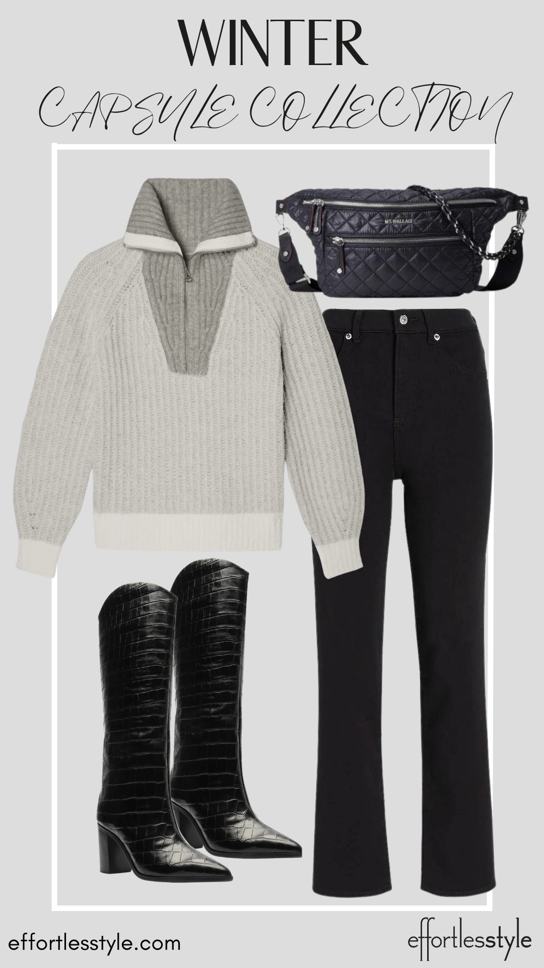 A warm and cozy sweater is a must this time of year. We love the silhouette of a half-zip sweater like this one for a winter wardrobe. And the colorblocking on this piece makes for some added interest in the capsule!