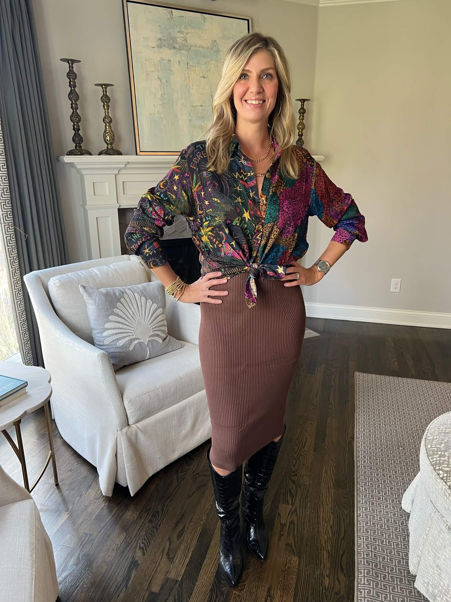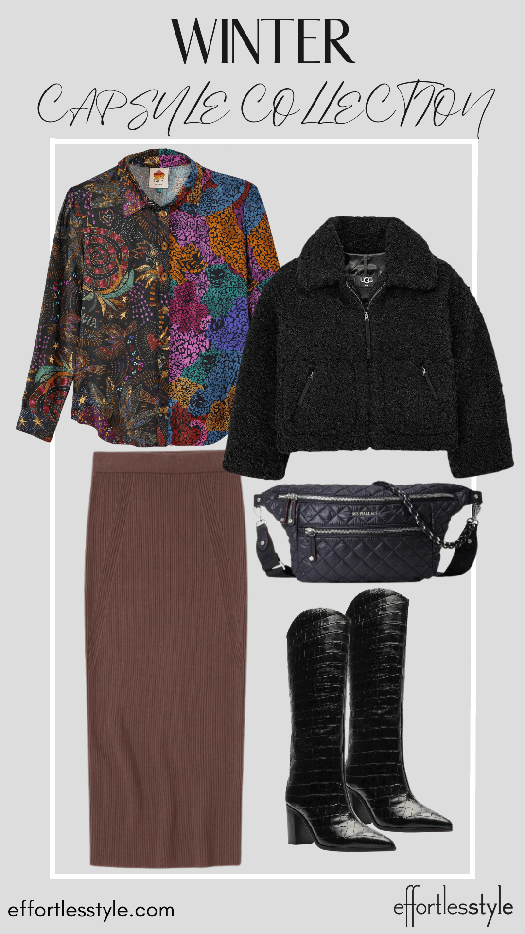 Printed Blouse & Leather Blazer & Black Jeans | Printed Blouse & Sherpa Jacket & Midi Skirt