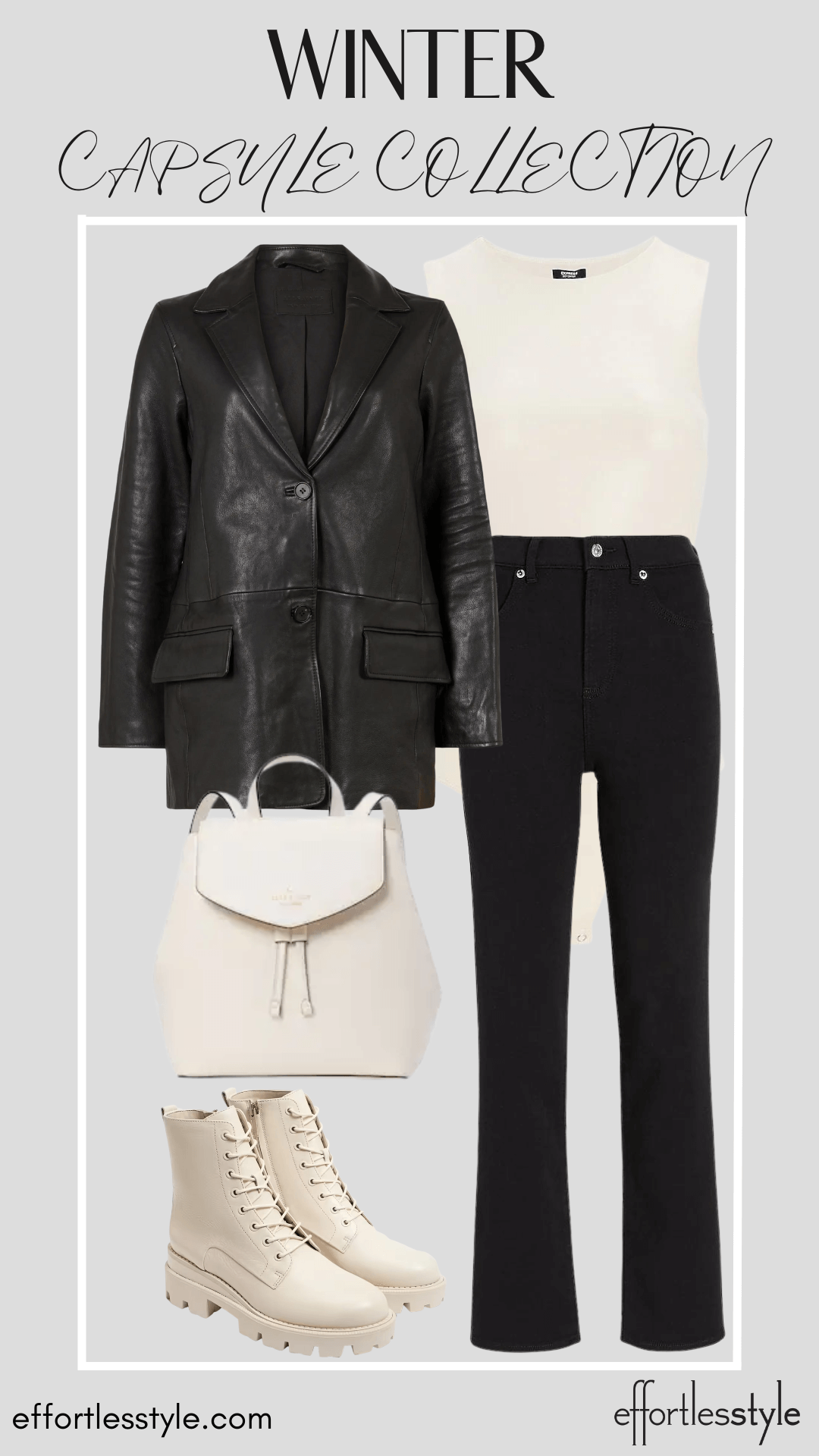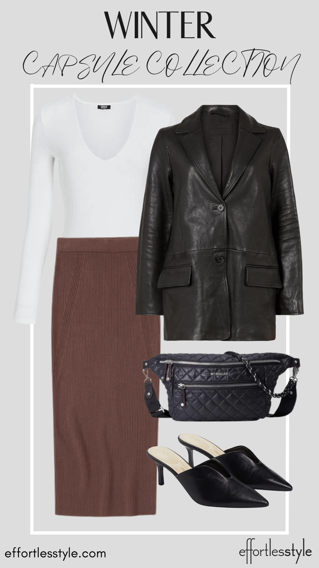Leather Blazer & Black Bodysuit & Dark Wash Jeans | Leather Blazer & White Bodysuit & Midi Skirt