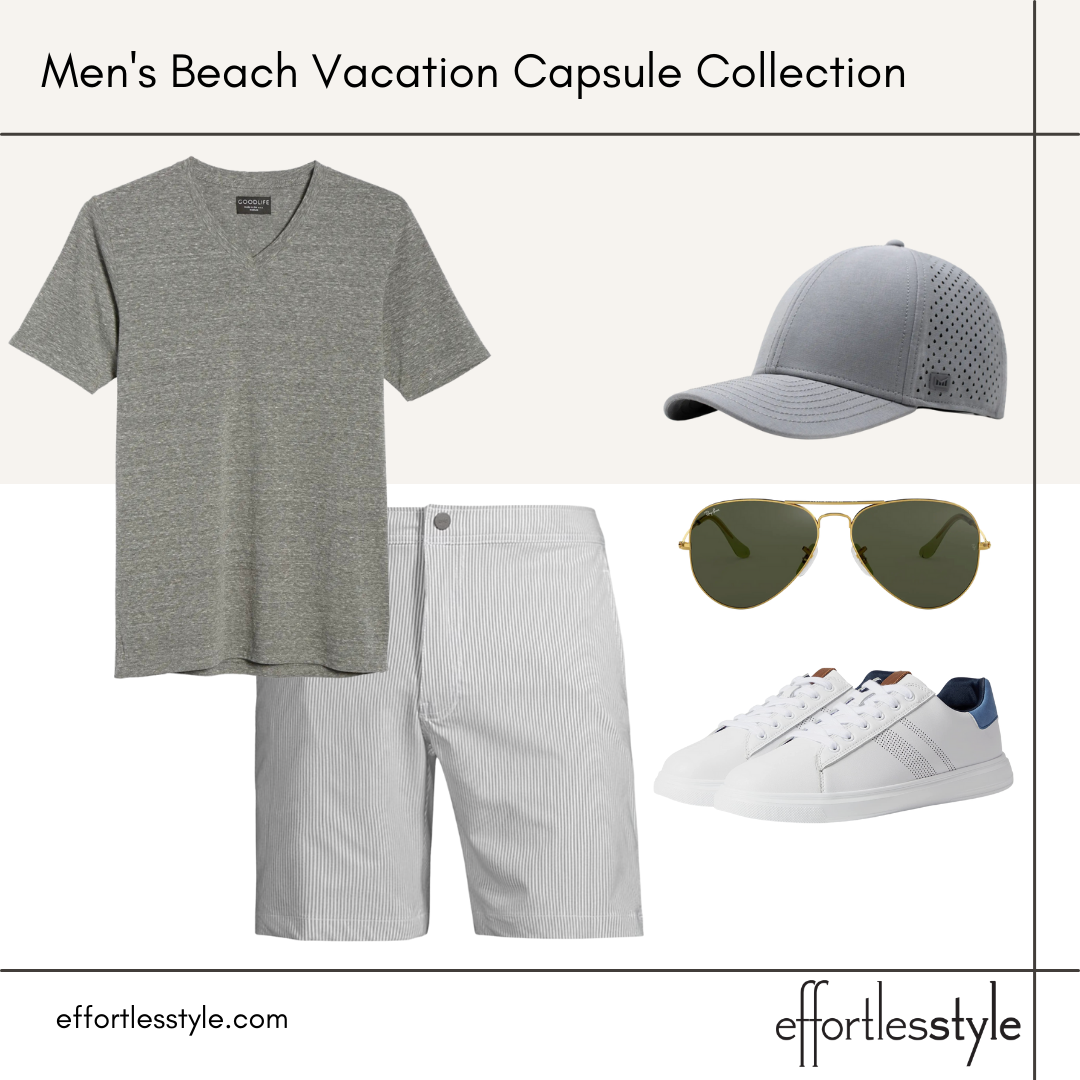 A v-neck tee is a “must pack” for a trip because it can be worn very casually with a swimsuit or athletic shorts…. And, you can dress it up a bit more by pairing it with a pair of nice shorts. We particularly love this grey v-neck paired with the striped seersucker shorts in our capsule, but it also works with the performance chinos as well!
