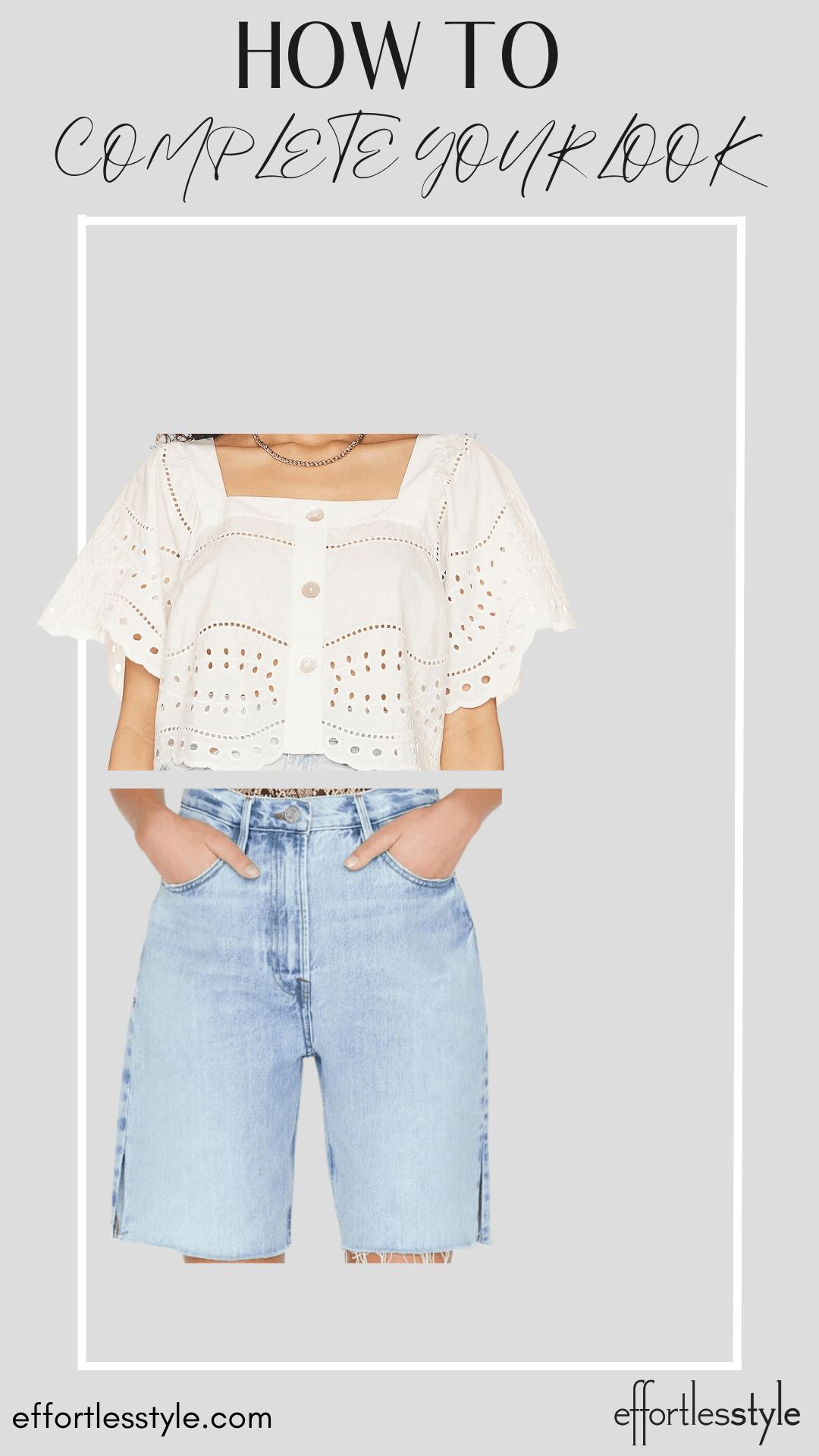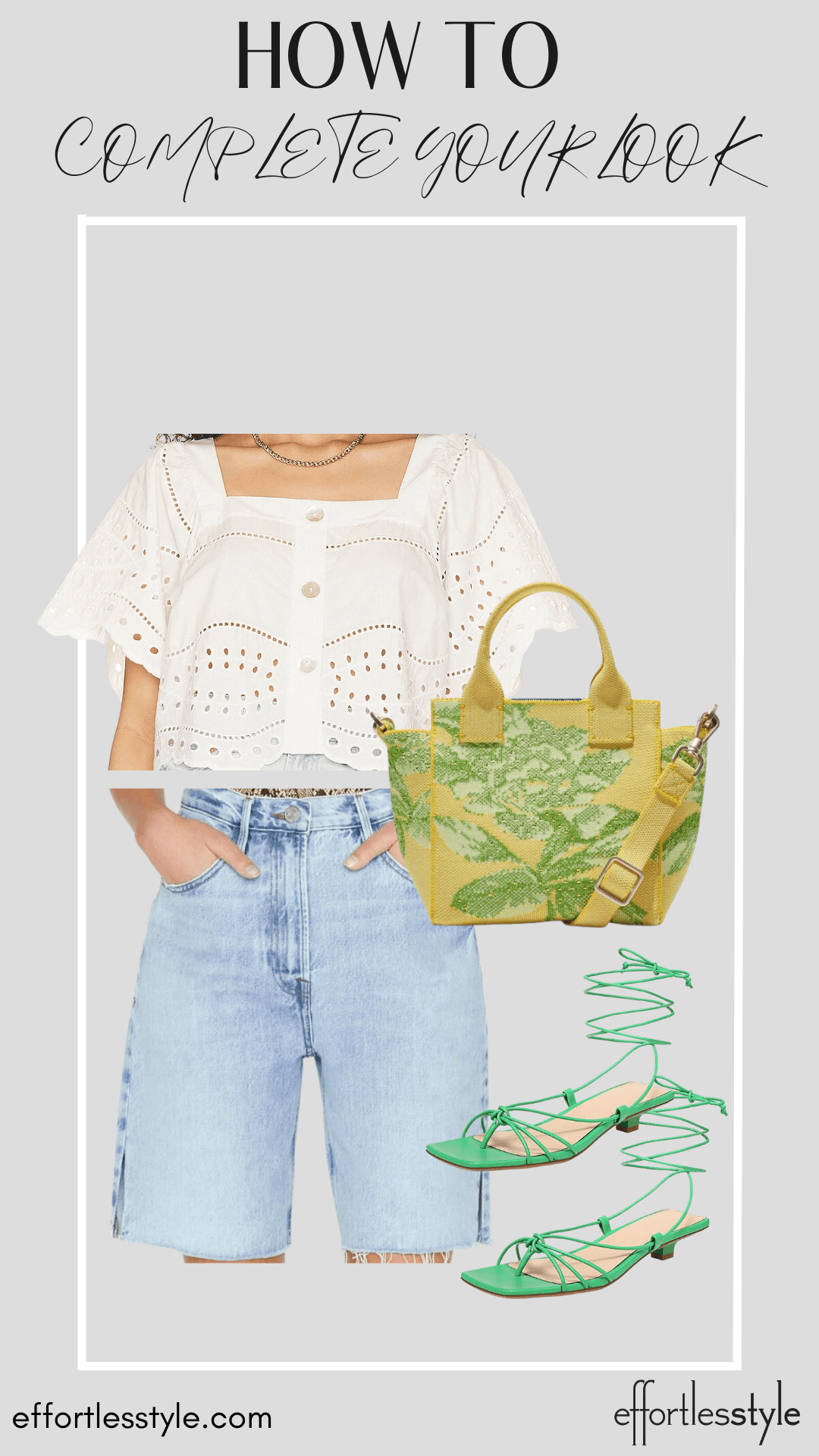 Embroidered Eyelet Top | High Rise Bermuda Jean Short | Floral Mini Handbag | Leather Strappy Sandal | Oversized Octagonal Sunglasses | Triple Layer Necklace