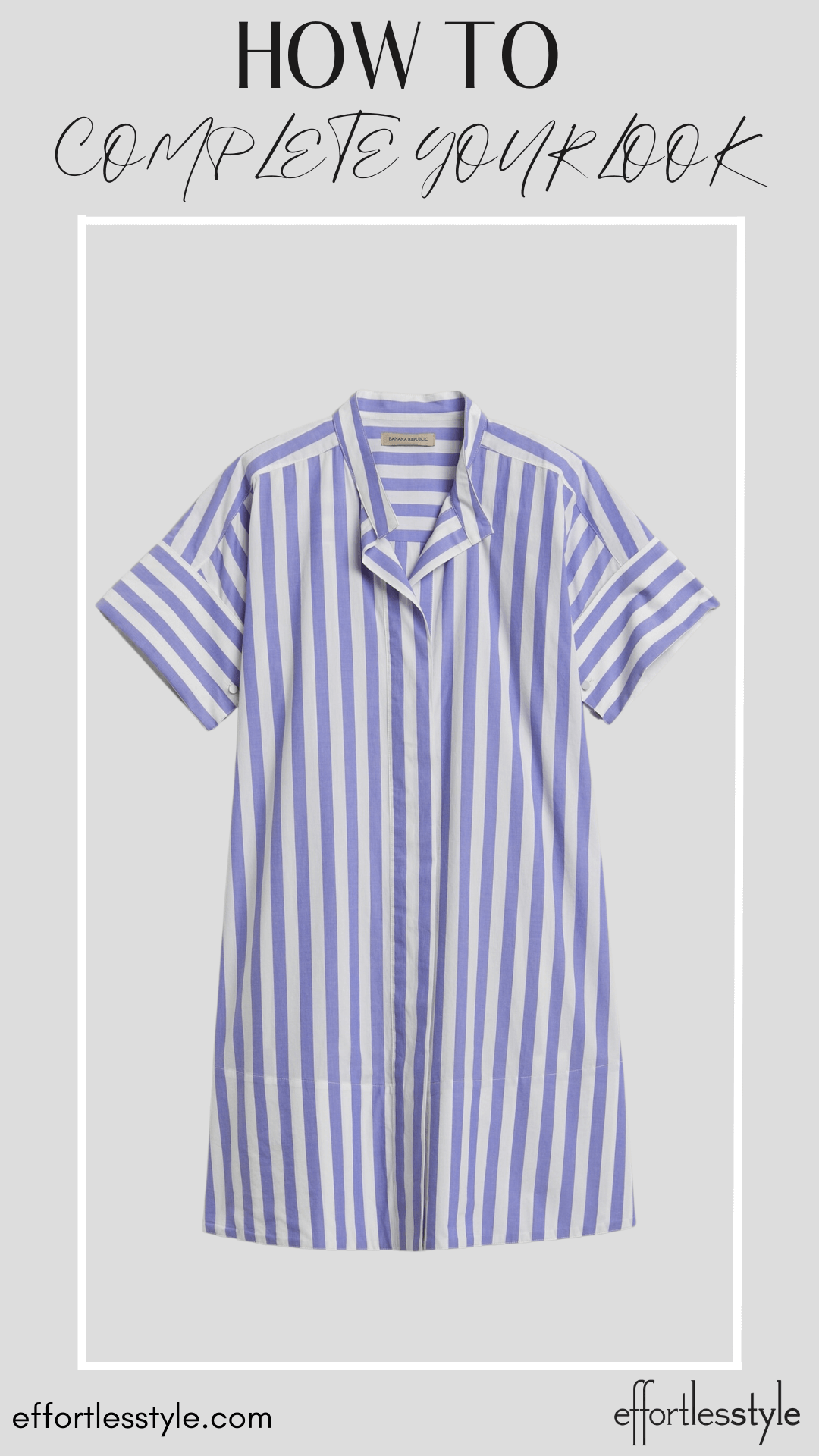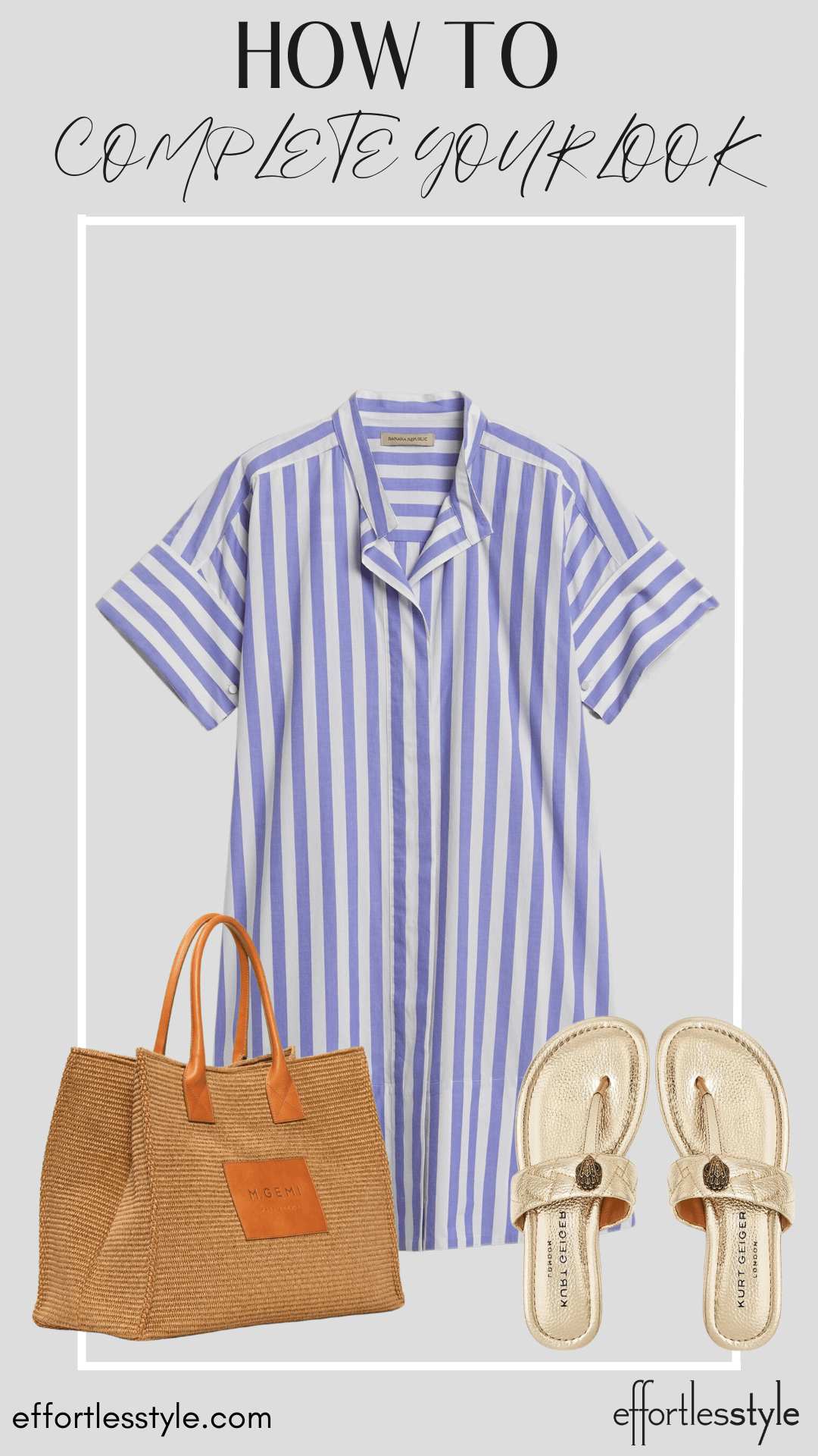 Poplin Mini Shirt Dress | Raffia Tote Bag | T-Strap Quilted Sandal | All Weather Bangles | Gold Chain Necklace | Gold Link Necklace