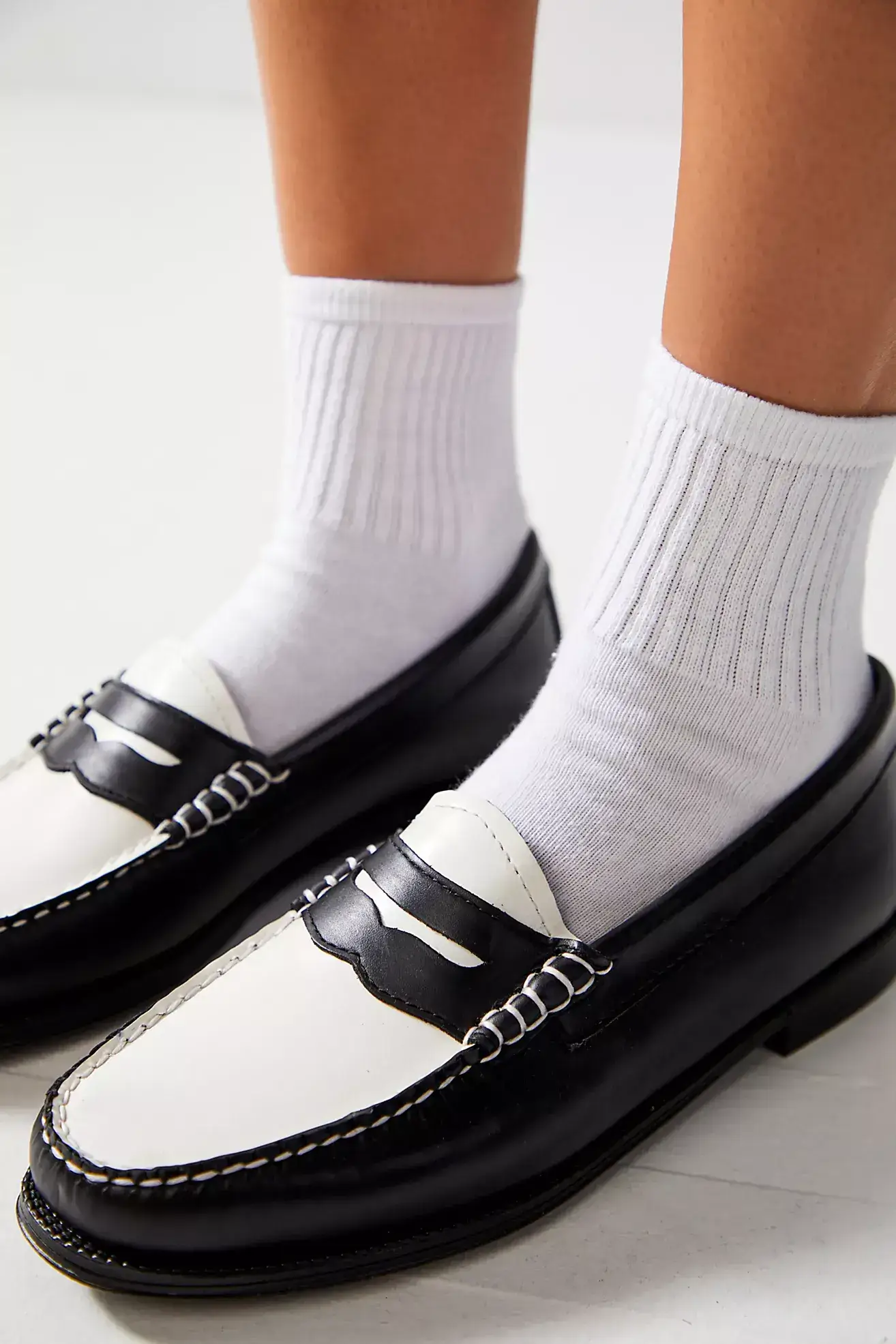 While loafers are still on trend, we’re moving away from the chunky styles of seasons past.  Sleeker styles are the current go to, and this black and white version will certainly add interest to any outfit.