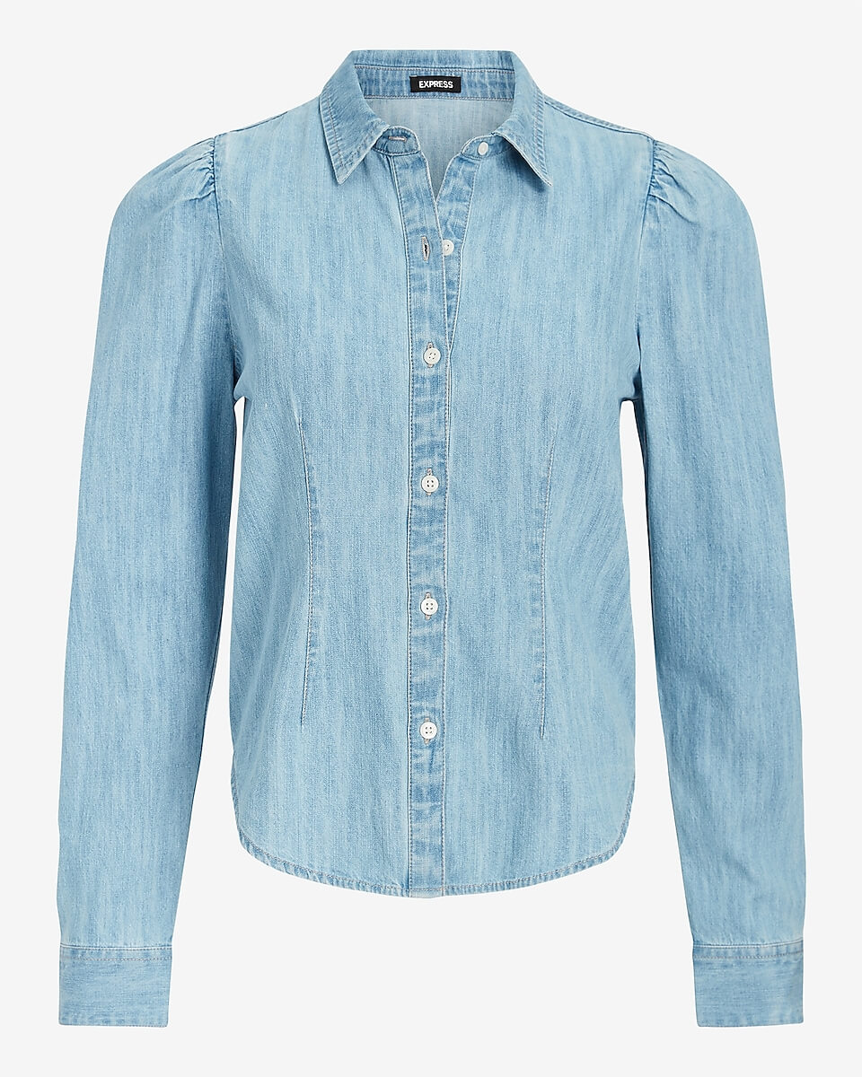 We always tell our clients that a denim shirt is a year round staple for their closet. We spotted this updated take on a denim shirt and loved it! The slightly puffed sleeves are just so fun.